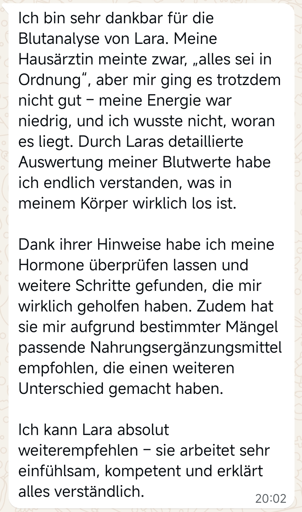 Erst als ich begann, meine Blutwerte funktionell zu analysieren und zu verstehen, was mein Körper wirklich braucht, konnte ich meine Selbstheilungskräfte aktivieren, meinen Hormonhaushalt natürlich unterstützen, unseren Kinderwunsch erfüllen und meine Energie zurückgewinnen.