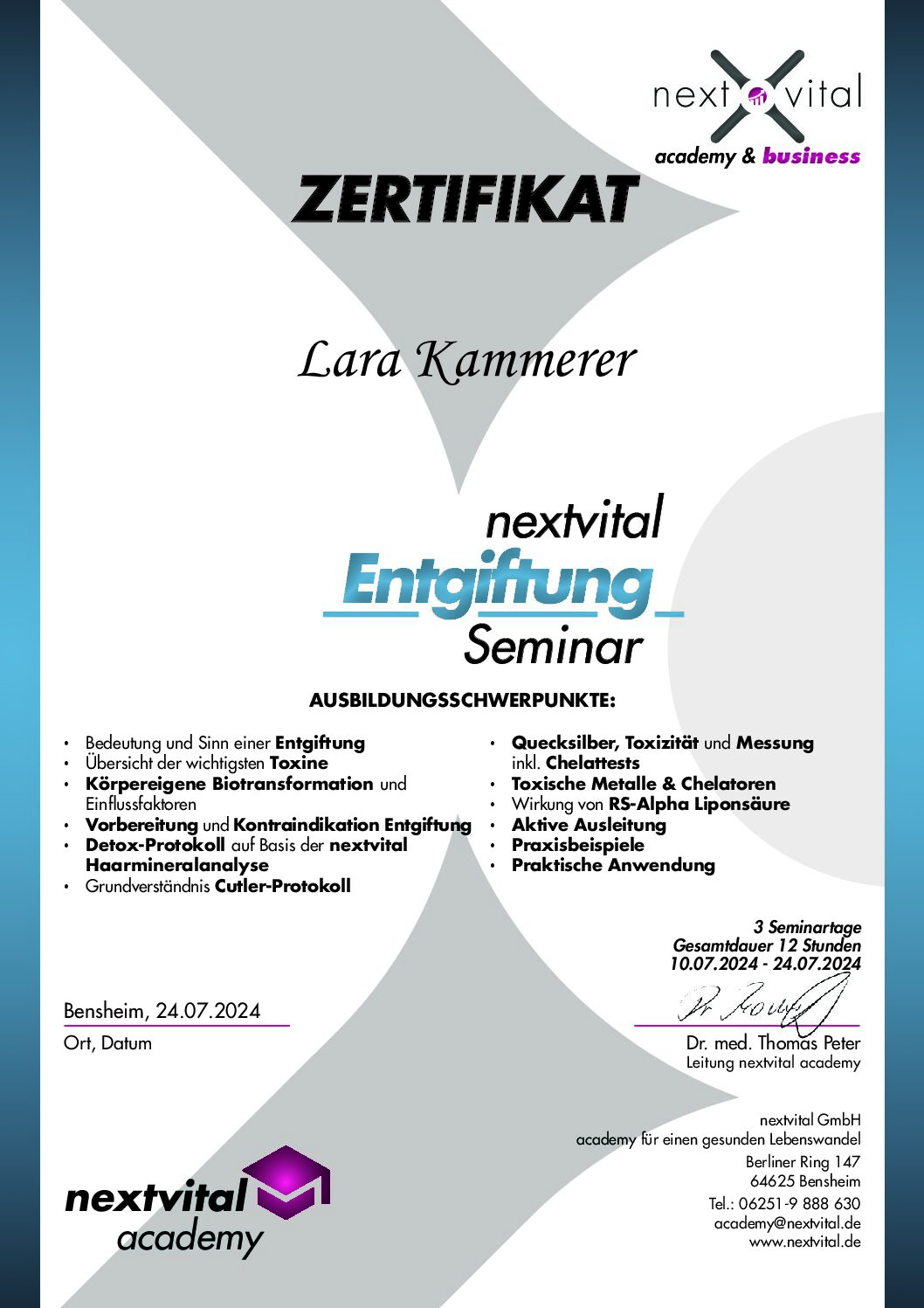 Und von März bis Juli 2024 habe ich die Ausbildung zum Nextvital Professional Coach beim ganzheitlichen Arzt Dr. Thomas Peter sowie seine weiterführenden Seminare zum Hormonsystem, Haarmineralanalyse und Entgiftungssystem gemacht. Das gibt mir die Möglichkeit, noch gezielter mit Dir an Deiner Gesundheitsförderung zu arbeiten.